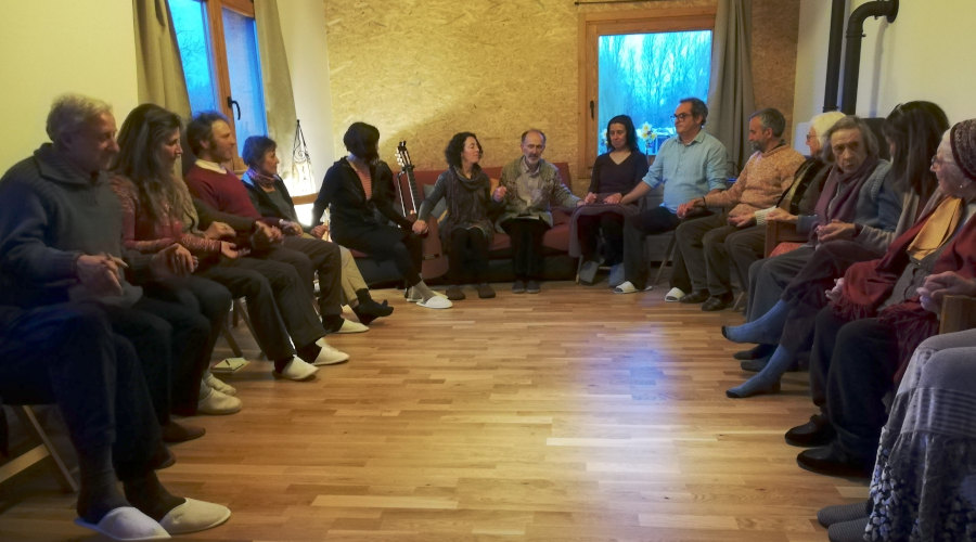 Comenzamos la celebración recordando la historia del terreno y construcción, de la mano de Inés, Leonor, Amelia y Hermelinda, las fundadoras de este lugar que Tierra Habitada ha heredado. Lo que ha sido durante muchos años una nave para talleres con niños, almacén y garaje, se ha transformado en un alojamiento cuyos criterios constructivos nos explicó José Luis, vecino, carpintero y el constructor de la reforma: materiales naturales libres de tóxicos, cuidado aislamiento térmico, apantallamiento de la instalación eléctrica… Todo pensado para ofrecer un espacio en armonía con la naturaleza y limpio de químicos y radiaciones electromagnéticas, apto para acoger a personas sensibles, así como a quienes tienen movilidad reducida.
